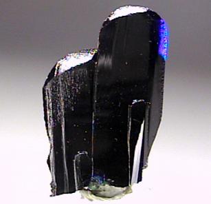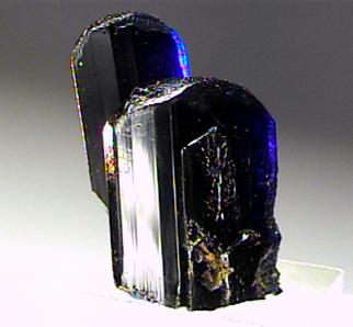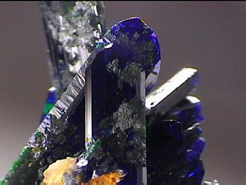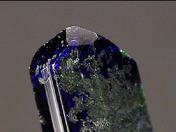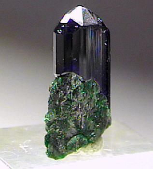 1.8 x 0.8 cm lustrous fully terminated crystal of azurite partially altered yo malachite.  When backlit this crystal looks like deep blue glass.