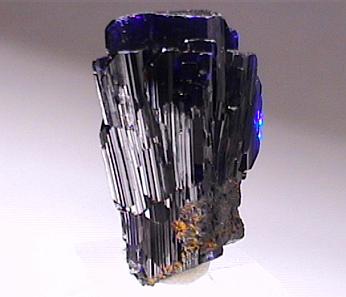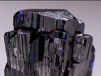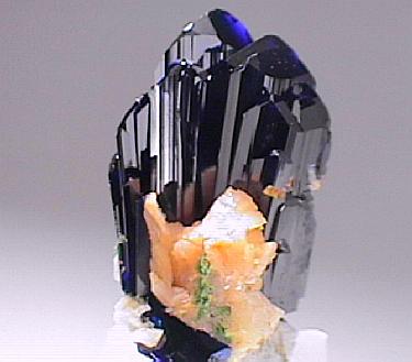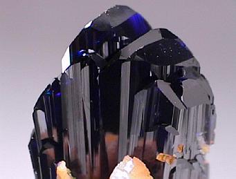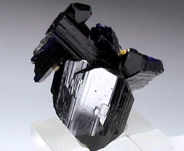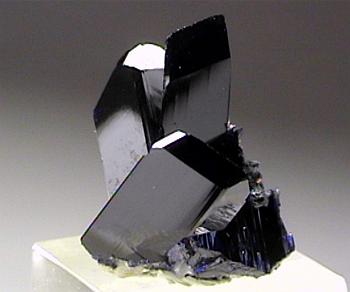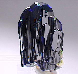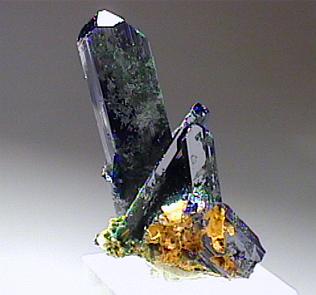 2.3 x 1.6 cm cluster of three lustrous and fully terminated crystals of azurite.  Like the others this one is essentially dark blue glass.