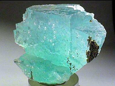 7.9 x 5.1 cm partial crystal of aquamarine colored fluorite with minor quartz and minute pyrite crystals.   There were a few flats of fluorite in one of the dealers tents and this was the only one that this incredible aqua color.