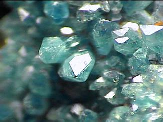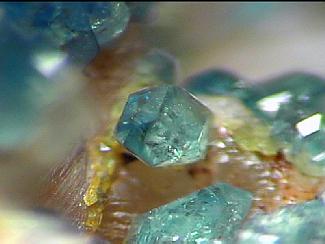 3.3  x 2.2 cm specimen of quartz with an exposed vug lined with lustrous bluish green crystals of scorodite to 2 mm across.  Several of the isolated crystals are gemmy and brilliantly lustrous.