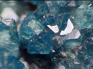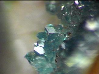 2 x 1 cm specimen of quartz with an exposed vug lined with lustrous bluish green crystals of scorodite to 1 mm across.