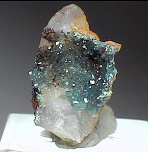 6 x 5 cm specimen of quartz with an exposed vug lined with lustrous bluish green crystals of scorodite to 3 mm across.