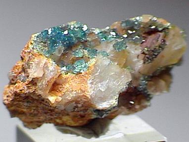Superb 5 x 3.6 cm specimen of quartz with an exposed vug lined with lustrous bluish colored  crystals of scorodite to 4 mm across.   This was one of the three best of the specimens available at the show.