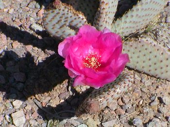 Here is a close up of a photogenic saguaro cactus with budding branches. The picture on the right is of a pear cactus species.  The flowers are electric with their color.