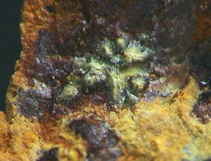Here is one of the three specimens I obtained from Jordi.  The cobaltarthurite is the olive green sprays in the close up.