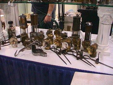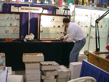 In addition to fine minerals Mike Bergman offers many mining artifacts including these miner's lamps.  The shot on the right is of Mike working on his display.