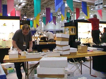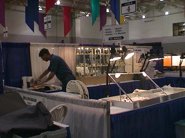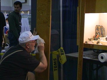 Here's Wayne Leicht of Kristalle (left photo) working on his booth while Cal Graber is doing the same with his and Leonard Himes.