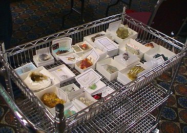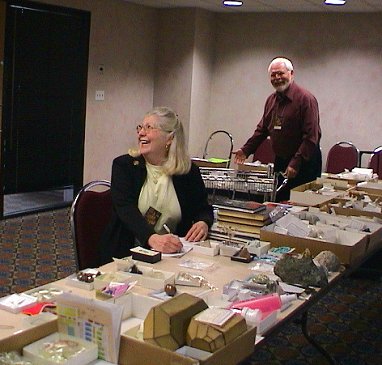 Here are Marie and Terry with the minerals for the auction held Saturday night.  The cart holds the specimens that will be posted to the web auction in mid March.
