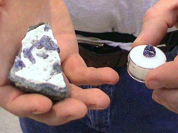 In the other hand is a 5+ carat cut stone that he found on that rock.  Rick bought the specimen for about $15 from Steve Perry and me (John Veevaert) as a piece of uncleaned benitoite mine material.  His eyes popped when he found this cuttable piece of benitoite rough plus another cuttable piece that had a finished stone over 2 carats.  The pictured finished stone is among the 10 to 15 finest faceted benitoites in existence.   For Rick's $15 investment his realized profit will be about $34,000.