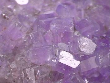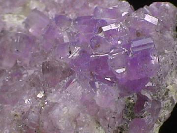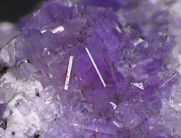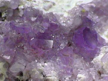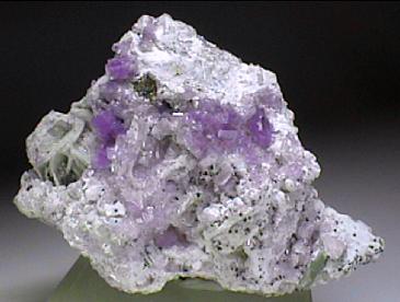 This specimen of mostly albite and quartz has scores of crystals of rich violet colored apatite.  The largest crystals reach up to 0.8 cm in length. Also present is a