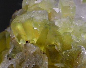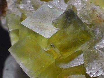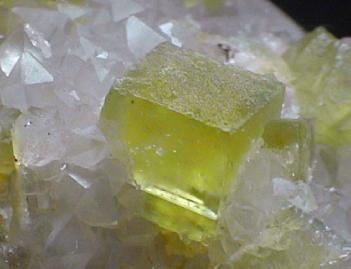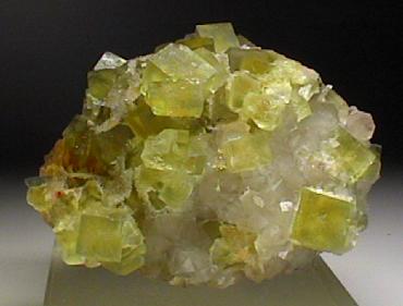 This specimen has numerous yellow crystals of fluorite to 1.3 cm across spread out over matrix