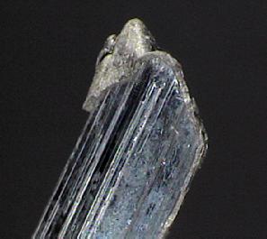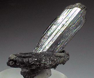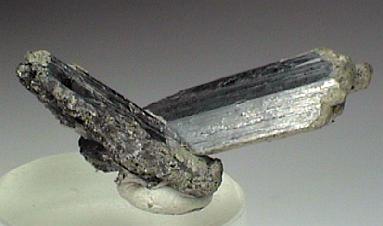 Fine specimen of two intergrown crystals of bismuthenite.  Both crystals are terminated on one end where