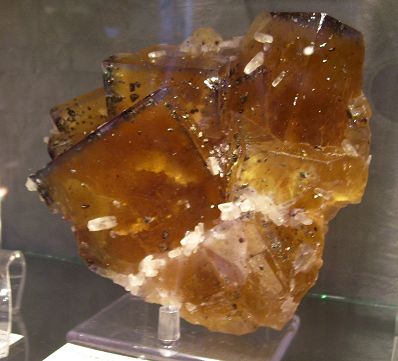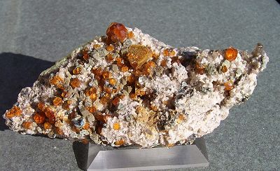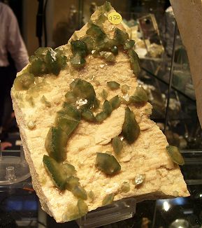 The group of Italians who manage Webmineralshop.com were set up in Hall A5 and I found several very good specimens of helvite from the now famous Fujian spessartine locality.  Another example of some of the interesting things coming out of China these days.  Helvite is an interesting mineral with the chemical composition of: Mn4Be3(SiO4)3S.  The crystals of these are fairly uniform in size at about 1 cm across and occur as text book examples of the hextetrahedral isometric crystal form.
