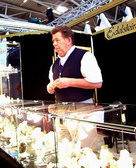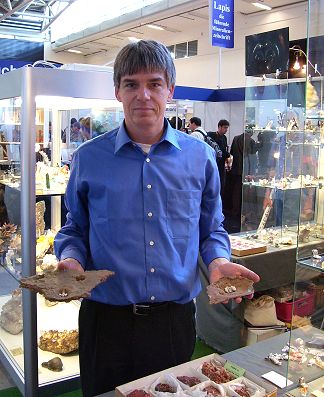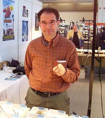 I spent some time visiting with Jordi Fabre.  Jordi is quite knowledgeable about minerals and has a great sense of humor. We had the chance to have supper one night at the Bauer Hotel near the show.  Lots of good discussion about the state of the mineral hobby over a draft Pilsner beer and bowl of pumpkin soup.  The pumpkin soup is incredible and almost worth the trip across the Atlantic on its own!  Jordi was selling specimens from the Jan Buma Fluorite Collection.  I found two off the wall Argentinean specimens which will make their way to the web when I get back home.