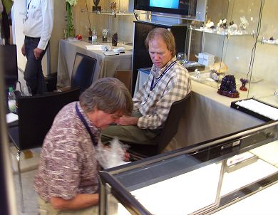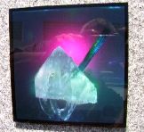 One of the people I met at the show and have known for some time now was Dan Balan from Canada.  You may recall that Dan was the guy known for shooting laser light through minerals to see what happened.  Back in 2001 at Tucson Dan approached me with an idea he had for creating holograms of exceptional minerals.  Well 4 years + since Dan has gone on to work with another group to develop realistic holography by taking mineral specimens and using lasers to generate perfect 3D images of the specimens in full color. It is stunning to see these in person.   Dan brought several type specimens of his latest work and allowed me to prepare several .wmv files which give a crude sense of what these are.  I have to tell you that these look like the real rock! The crystal surfaces even reflect light as if they were the real thing!!