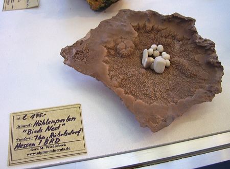 Set up in Hall A5 was German dealer Gerd Wiedenbeck.  What caught my eye were several travertine formations he had on display.  These formed in old abandoned Richelsdorf mine.  Gerd explained that the ground water seeping through the mine produced these small pool formations.  If there were any subsequent fragments of wall rock or dust that entered the pool and were not swept away they became encased in aragonite and continued to grow while rolling around loosely in the small "nest". Gerd found several of these and I bought one for the future Munich Show update.  They look just like little loose eggs in a nest.