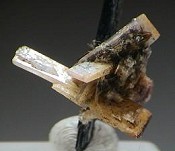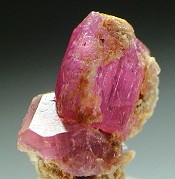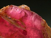 Red Beryl - (correction) Pezzottaite or Madagascarite not Pelozzaite- from Madagascar - I wandered into the Theater to see a few folks and saw that the Madagascar red beryls, first seen at Tucson, of Lino Caserini were still in his case.  He was the only one who had these matrix specimens at the show.  He had some fine specimens with the beryls on matrix available but they were pricey for small crystals.  I did not obtain any of these.  I also visited with Laurent Thomas who had these specimens first at Tucson.  He offered me some specimens of single crystals that I did purchase and he also informed me that the cesium rich beryl is most likely going to be described as a new species with the tentative names of either Madagascarite or Pezzottaite.  The story of these is quite intriguing and shows how the Internet is affecting the supply and distribution of minerals as the Madagascar government forbid the export of these while the Tucson Show was underway and after they had seen what the prices were that were being asked.  Other miners who had been working the deposit and salted them away also brought them out to dealers there in Madagascar when the word spread that these were worth a lot creating a temporary surge in the supply.  Subsequently, the government has relaxed the restriction on export but is working diligently to regulate it. All of this creates an uncertainty about the true existing and future supply of these. Laurent passed along a lot more of what he had learned about the geology of this deposit and there appears to be potential, given a more refined approach to mining, for a larger production from this deposit.  Look for more news about these beryls on my website as time progresses.  I have a selection of a few loose crystals - some quite large and one very nice TN specimen pictured to the left here.