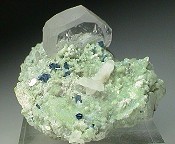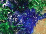 Brochantite & Linarite - New Find! from Morocco - In the Theater I was working through the isles when something caught my eye at the booth of Pierre Clavel - specimens that at first appeared to be azurite and fuzzy malachite.  A closer inspection of the unlabeled specimens revealed that they were brochantite and the blue was in fact linarite!  This was rather exciting since it is the first occurrence of linarite that I know of from Morocco.  The habit is very similar to that found in Socorro County, New Mexico with flat lying but large crystals of linarite to 2 cm in length or even a little more.