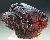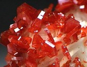 Vanadinite from Morocco - No show from Sainte-Marie is complete without some specimens of vanadinite from Morocco.  There is so much of it around here that the town of Sainte-Marie probably would look red from the International Space Station.  It is true that there is a bundle of vanadinite here but the vast majority of the material is sadly lacking in terms of color with the majority being a dull to brownish hue.  If you look hard enough you can find specimens with the trademark "Coca Cola" red color.  At this show French dealer Righi Umberto had a number of very fine specimens that I could not resist.  All of the specimens presented here are choice select pieces.  I never knew lead and vanadium could look so good!