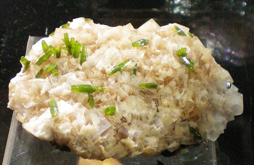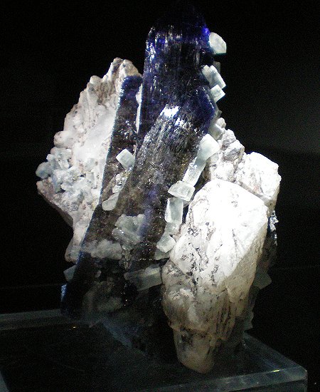 One of the most incredible rocks here in Tucson - a 20 cm specimen of tanzanite on calcite matrix with icy blue prehnite crystals.