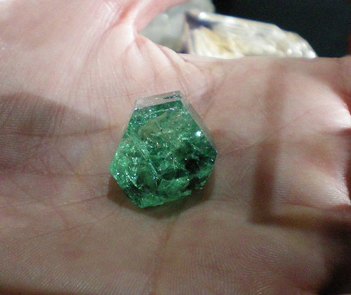 A 3+ cm tsavorite from Tanzania in Christophe's hand.