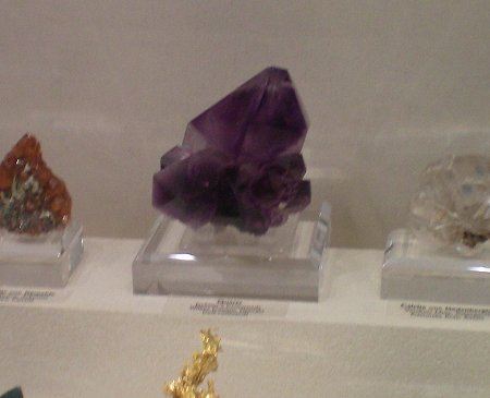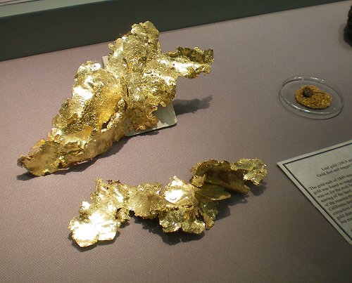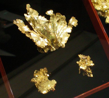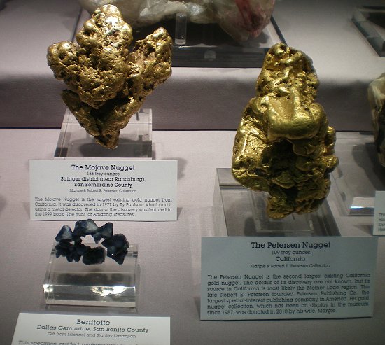 A closer view of some of those "chunks" - two large gold nuggets and what is arguably one of the finest specimens of benitoite - the famous chain... drool...