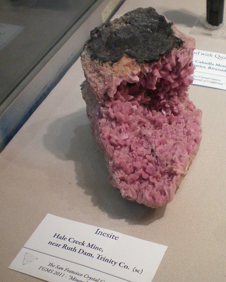 The last specimen in this case that caught my eye was a little piece of my home county - Inesite from the Hale Creek mine in south western Trinity County. I live about 50 miles to the north and east in Weaverville in the heart of Trinity County.  Inesite from here used to be the world's best until the great discoveries in South Africa and China.