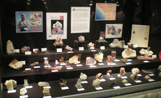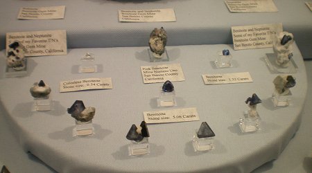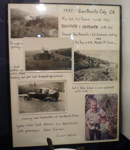 Susan Harlow had a case of specimens from the Benitoite Gem mine and some great old photos of trips there in the late 1930s.