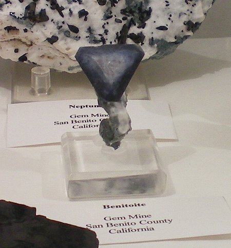 John has one of the best benitoite specimens I know of a fine triply terminated crystal on a small pedestal of crossite/natrolite matrix.